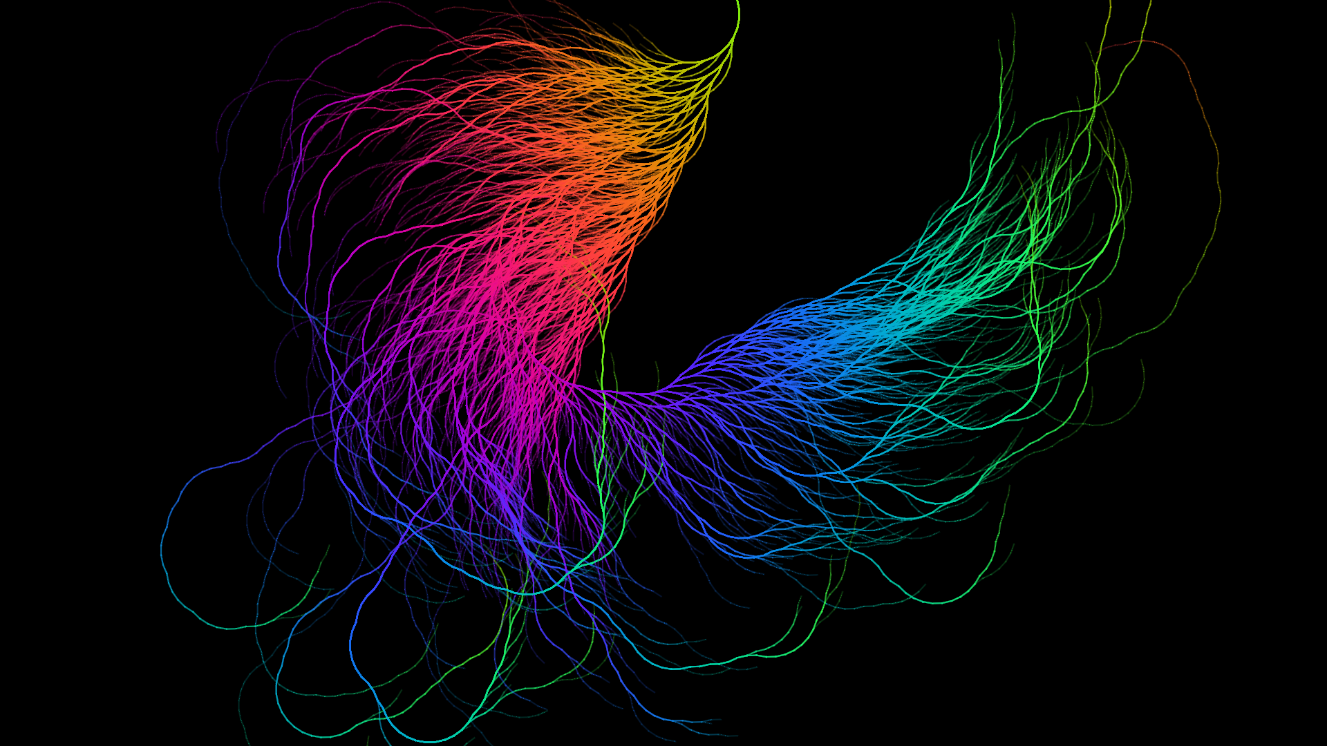 The Aizawa attractor is a chaotic system of equations that when applied iteratively in a 3D space creates an interesting evolving pattern. It is also possible to run the simulation with a number of different initial states for each of the particle.